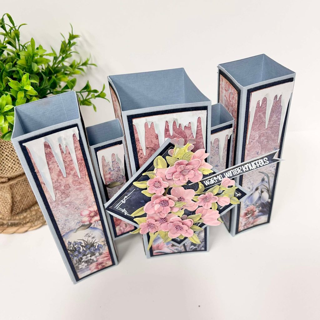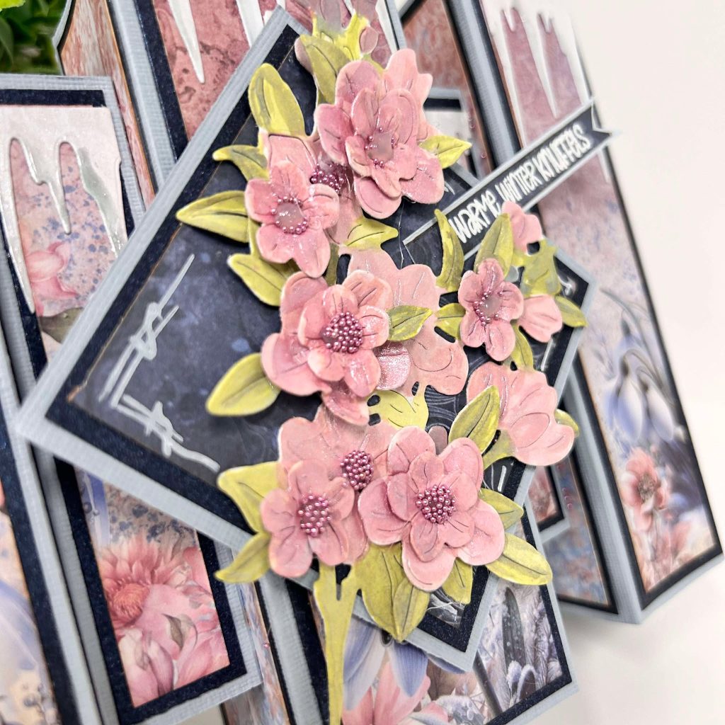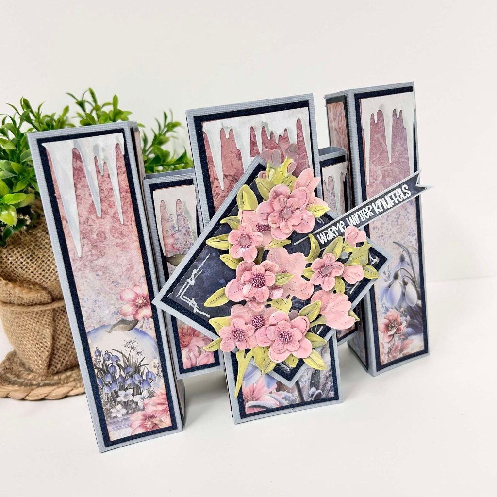 In de LIVE workshop legt Thera heel duidelijk uit hoe ze deze 5-panelenkaart maakt. Het mooie papier komt uit de nieuwe collectie Frozen Flowers van Studio Light. In dit blok zit behalve designpapier ook effen cardstock. De mooie ijsrand aan de bovenkant van de kaart heeft Thera gemaakt met de nieuwe snowdrop mal. Met de watercolor shimmer set heeft Thera een glanslaagje op de ijsrand gemaakt.