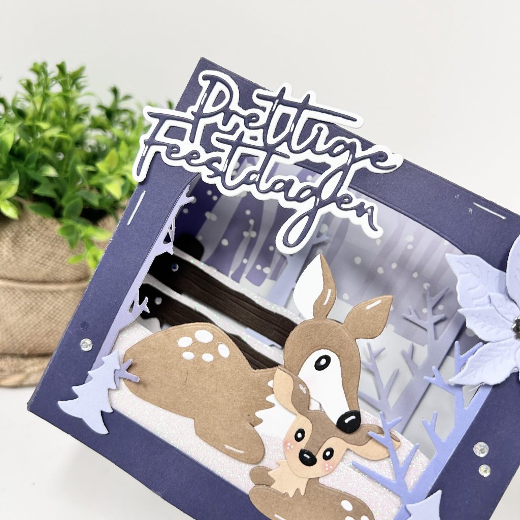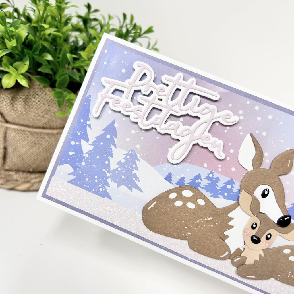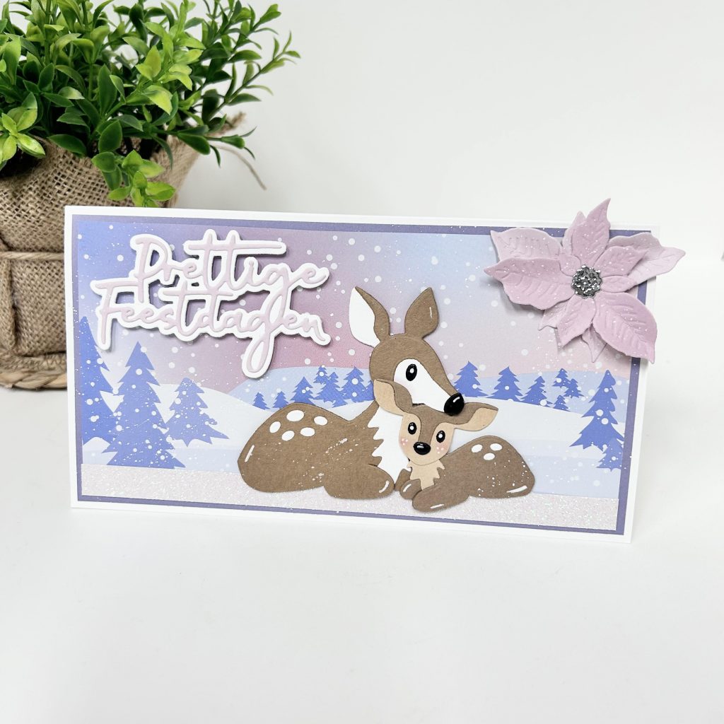 Met de nieuwe knipvellen van Eline maak je snel een leuke winterse kaart. De kleuren van het knipvel passen natuurlijk weer perfect bij het nieuwe papierblok winter dreams van deze maand. Op onderstaande kaart heeft Anouk het mama en baby hertje bij elkaar in de sneeuw gezet. Zijn ze niet lief zo samen? De tekst prettige feestdagen en de poinsettia heeft Anouk gestanst uit het nieuwe papier. Het sneeuwrandje is gemaakt met het nieuwe glitterpapier van Bella Lulu.