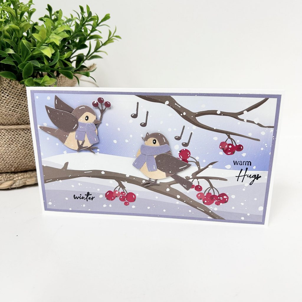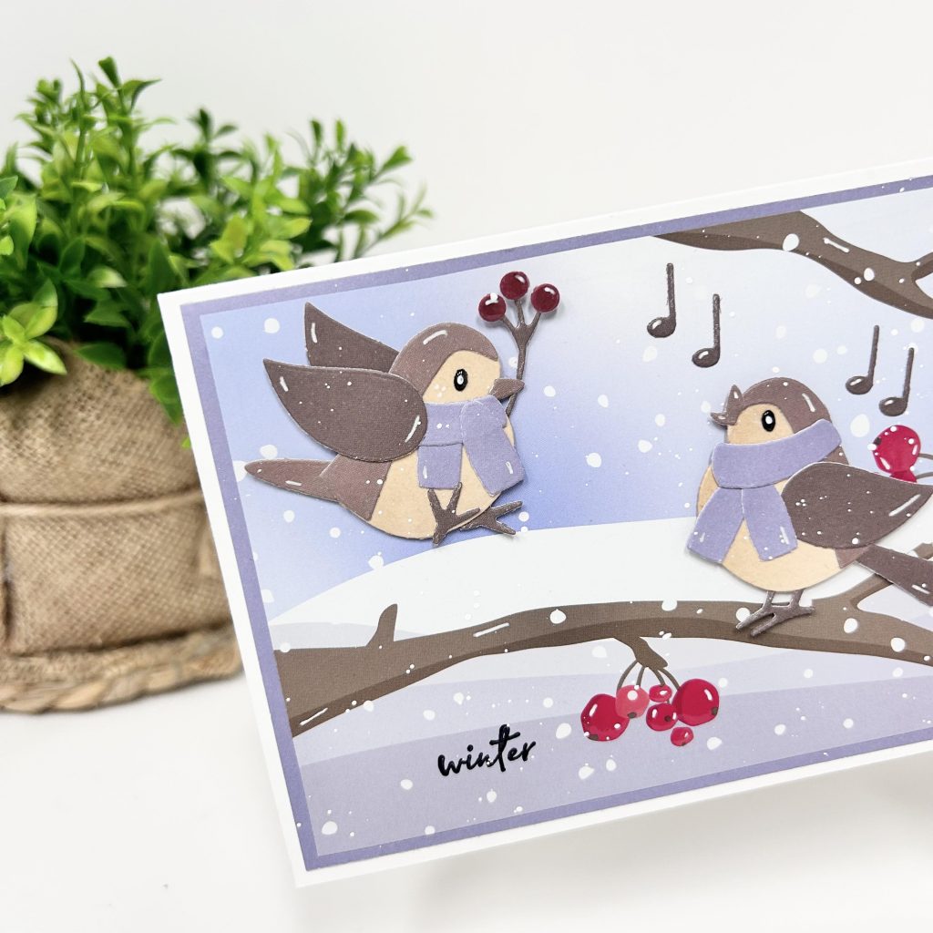 Deze maand zijn er 2 nieuwe collectables uitgekomen van Eline waaronder ook deze schattige vogeltjes. De vogeltjes kan je ook weer heel leuk verwerken op het nieuwe knipvel waarop de takken al voorbedrukt zijn. Met deze nieuwe mal kan je heel verschillende vogels maken in verschillende kleuren en houdingen. Zoals jullie zien komt op onderstaande kaart een vogeltje net aanvliegen en het andere vogeltje is druk aan het zingen. Door de vogels een sjaal om te doen zien ze er nog schattiger uit. Anouk heeft met de glossy accent pen van Studio Light de besjes wat glans gegeven waardoor die er nog beter uitspringen op de kaart. Een tekst stempelen op het achtergrondvel kan met Stazon inkt. Hier heeft Anouk de leuke stempel Christmas mail van Marleen voor gebruikt.