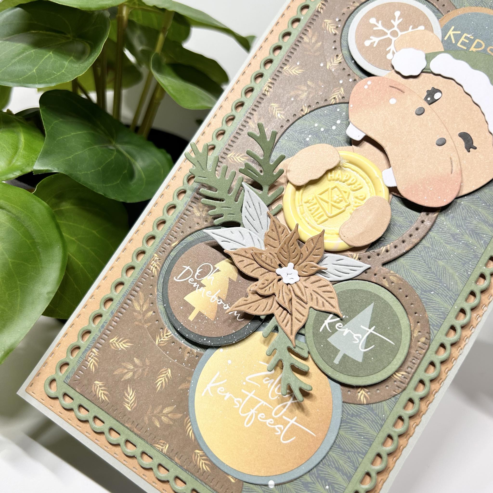 De lay-out cirkel mal van Marleen blijft onwijs populair, ook nu wordt hij weer veel gebruikt omdat de nieuwe cirkelstansen en stickers hier precies in passen. Omdat de lay-out cirkel mal een no end mal is kun je deze op verschillende manieren gebruiken. Je kunt de mal recht of schuin stansen en hiermee dus ook een vierkante of een slimline kaart mee maken. Het designpapier dat Jolanda heeft gebruikt is het nieuwe designpapier christmas at home van Marianne Design. Behalve designpapier heeft Marianne Design nu ook bijpassend cardstock uitgebracht, hoe handig is dat! Uit de grote cirkel heeft Jolanda Henri laten piepen en hij heeft de nieuwe waxzegel happy paw mail in zijn handjes. Een kerstmuts en de poinsettia van Hobbizz maken het kaartje helemaal af.