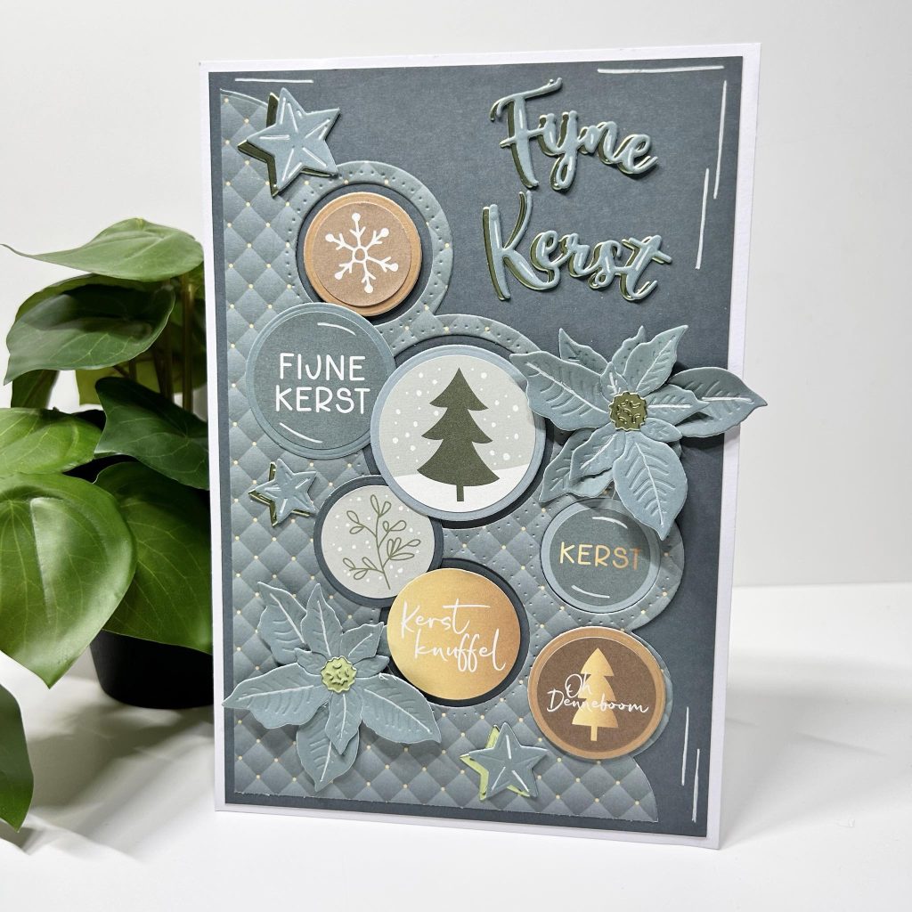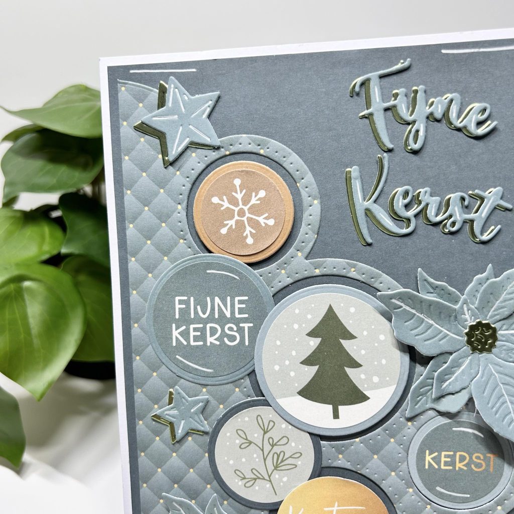 Anouk was voor haar DEMO begin augustus natuurlijk ook al aan de slag gegaan met deze leuke artikelen en ze heeft er een iets klassiekere kerstkaart mee gemaakt. Anouk heeft ook stickers uitgezocht die bij de blauwe kleur van het papier passen. De stickers hoeven ook niet precies in de lay-out mal te passen maar het is net leuk om hier mee te spelen. Ook hier en daar een extra sticker een stukje over elkaar plakken geeft een speels effect. De tekst fijne kerst heeft Anouk gebruikt uit de nieuwe kerstbal mal van Marianne Design. Bij deze mal zitten ook de sterren die Anouk op haar kaart heeft gebruikt. De Poinsettia op Anouk haar kaart komt uit de kerstcollectie van vorig jaar.