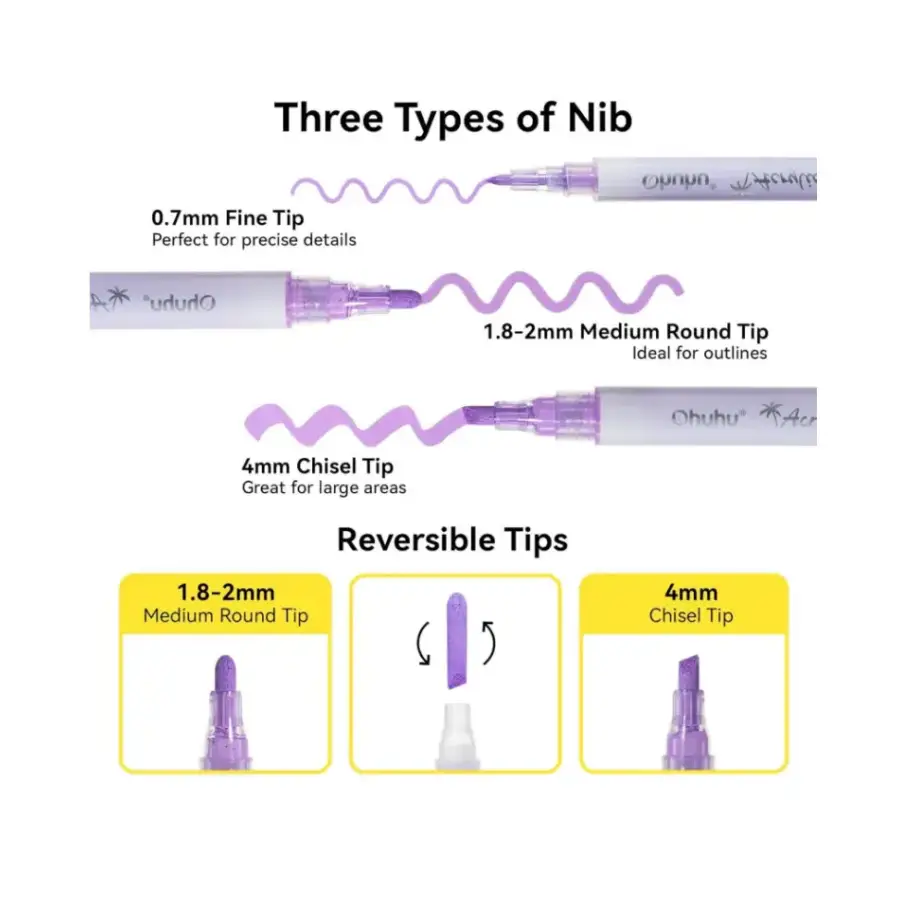 Ohuhu acrylic markers gebruiken een levendige, geconcentreerde inkt op waterbasis die niet giftig en geurloos is. Ze tekenen soepel, waardoor eenvoudige laagjes en een hoge dekking mogelijk zijn, waardoor ze geschikt zijn voor zowel beginners als ervaren kunstenaars.