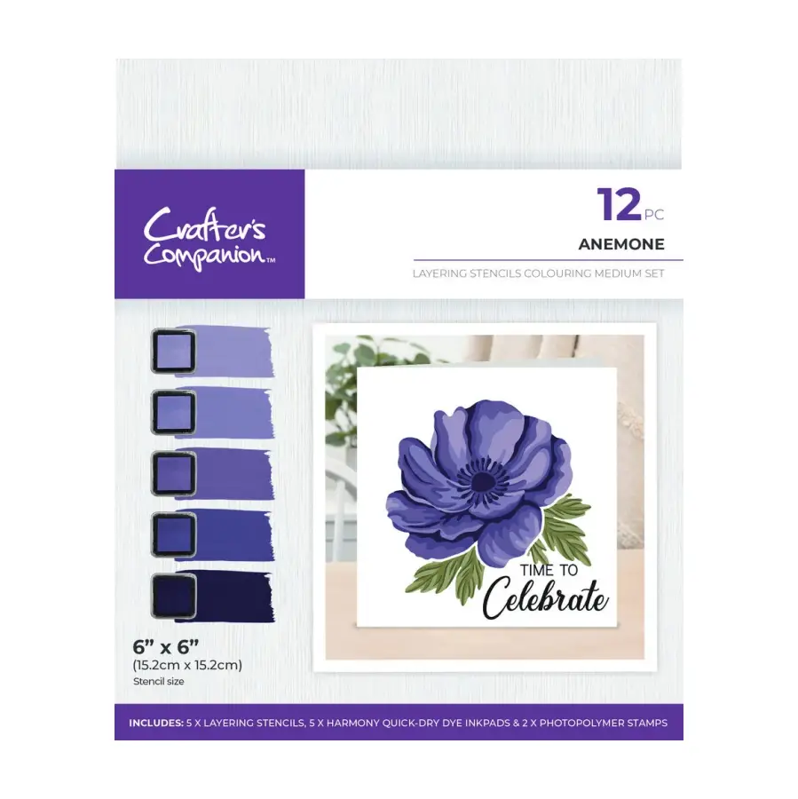 12-delige stencil- en stempelset om een ​​veelkleurig rozenontwerp te creëren. Inclusief vijf stencils en twee sentimentstempels (Time to & Celebration). Inclusief vijf Harmony Quick-Dry Dye-inktkussens in paarse tinten. Sjabloongrootte: 8 “x 8”. Onderdeel van het assortiment Layering-stencils van Crafter’s Companion.