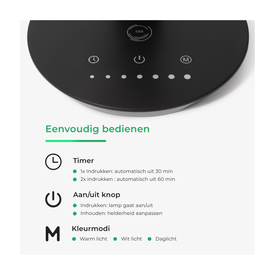 “Twee AUTO-OFF Timers” (30/60min) zijn beschikbaar om de lamp automatisch uit te schakelen. Druk 1x op de klok touch knop en lamp schakelt zich na 30 minuten uit. Druk nogmaals op de klok touch knop en de lamp schakelt zich nu na 60 minuten vanzelf uit.