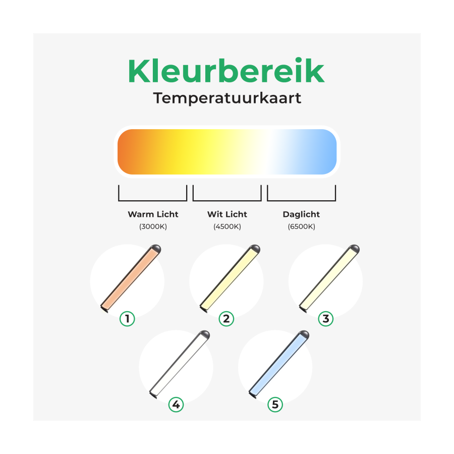 – Kleurtemperatuur: 3000, 4000, 4500, 5000 en 6000 kelvin (daglicht)
