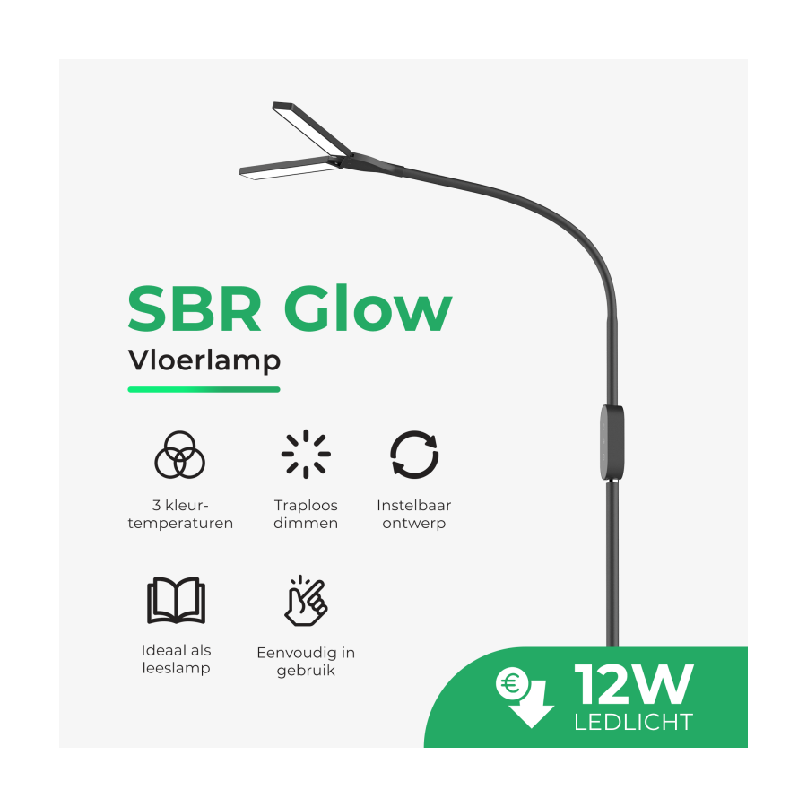 Ben je op zoek naar een vloerlamp die perfect past bij je interieur én jouw behoeften? Met de SBR Glow zwarte vloerlamp verlicht je elke kamer op jouw gewenste manier. De dimbare led verlichting en meerdere lichtkleuren zorgen voor de perfecte sfeer. Dankzij de buigbare arm en in hoogte verstelbaarheid, kan deze lamp altijd de juiste plek verlichten. De verzwaarde voet zorgt voor stabieliteit en de timer zorgt voor automatische uitschakeling.