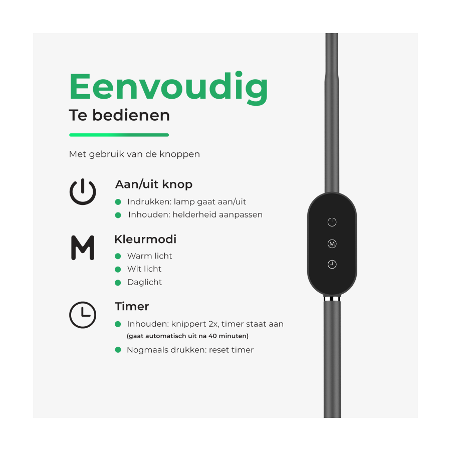 – De timer zorgt ervoor dat de lamp automatisch na 40 min. uitschakelt, handig als je even vergeet het uit te doen.