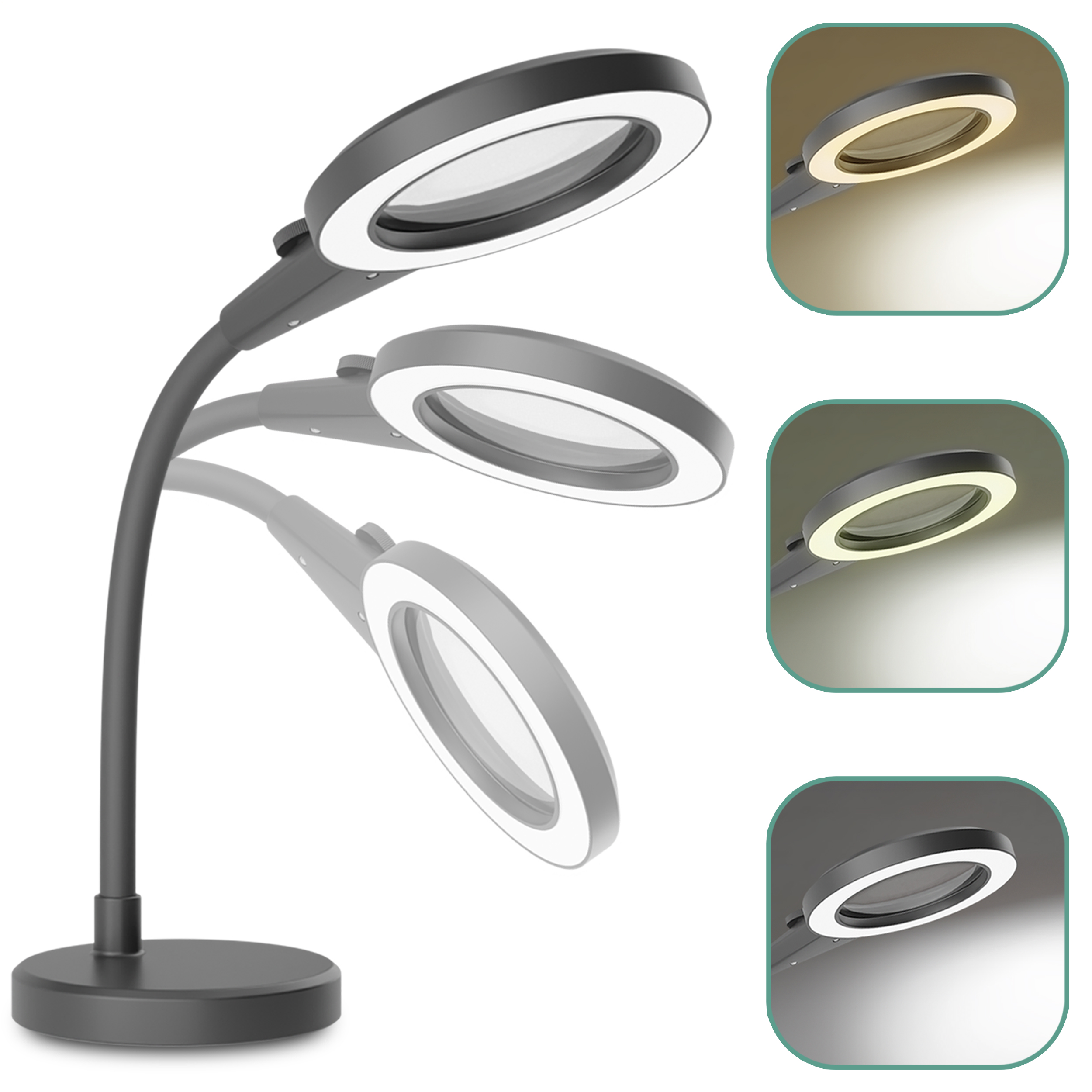 Met een indrukwekkende lensdiameter van 9 cm biedt de SBR Zoom+ een vergroting van 1,75x (3,5 dioptrie), zodat je zelfs de kleinste details haarscherp kunt zien. De traploos dimbare LED-verlichting heeft drie instelbare kleurtemperaturen (3000, 4500 en 6000 kelvin), waarmee je eenvoudig het licht aanpast aan je werk en de omgeving.