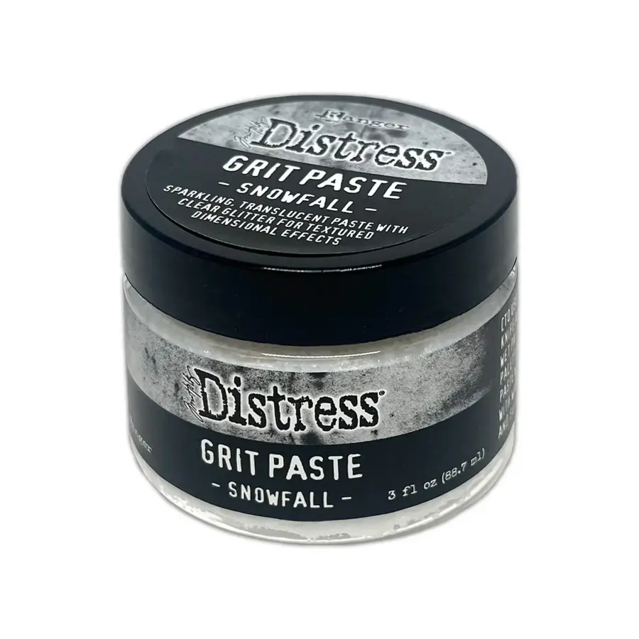 Tim Holtz Distress Holiday Mixed-Media Medium – Snowflake Grit Paste voegt een vleugje textuur toe aan winterse creaties. Snowflake Grit-Paste is een driedimensionaal, transparant medium met een heldere glitter die opdroogt tot een textuurrijke, glinsterende finish. Aanbrengen op projecten met het Distress Palette Knife. Verkrijgbaar in een pot van 85 ml met brede opening. • Dimensionaal • Multi-oppervlak • Textuur • Transparant