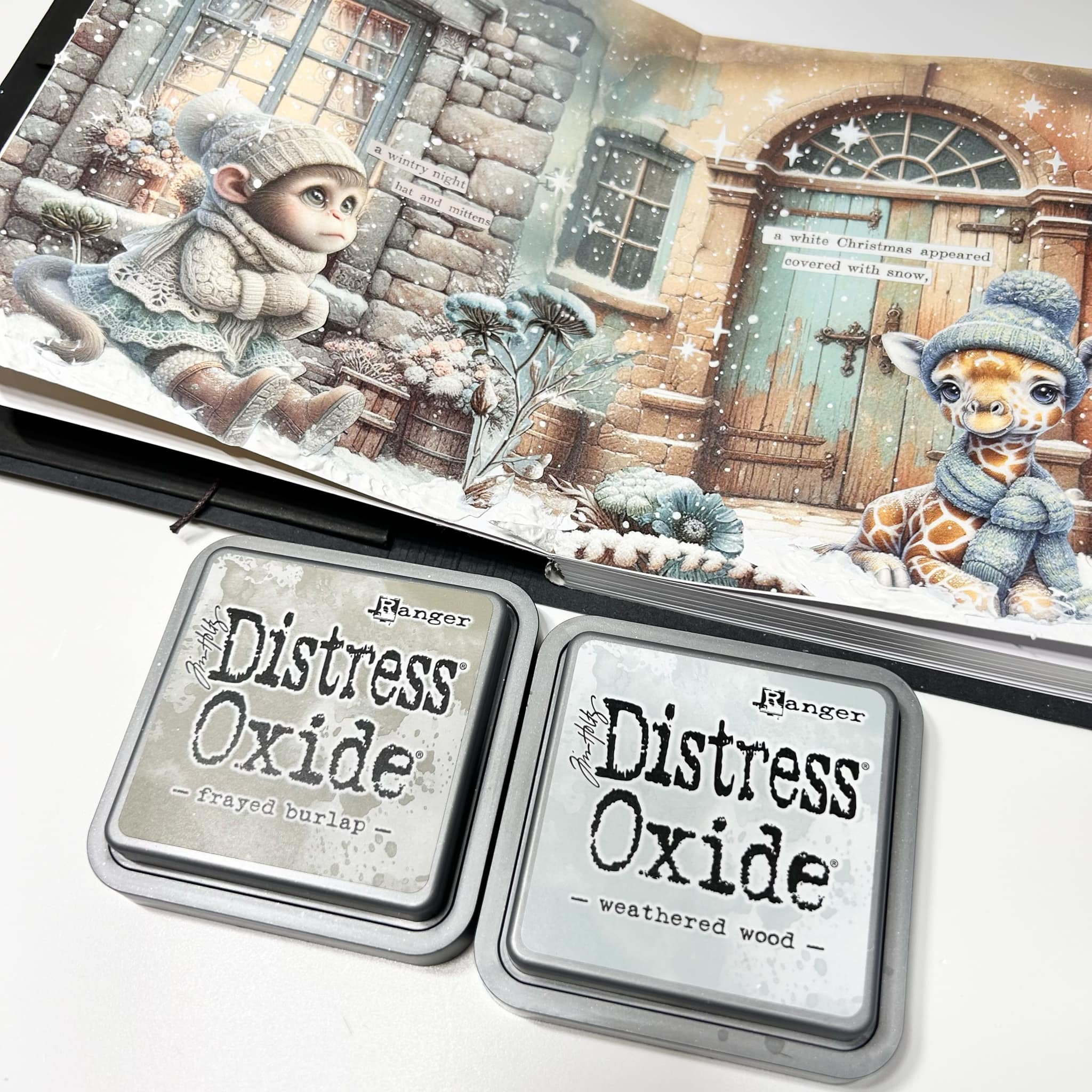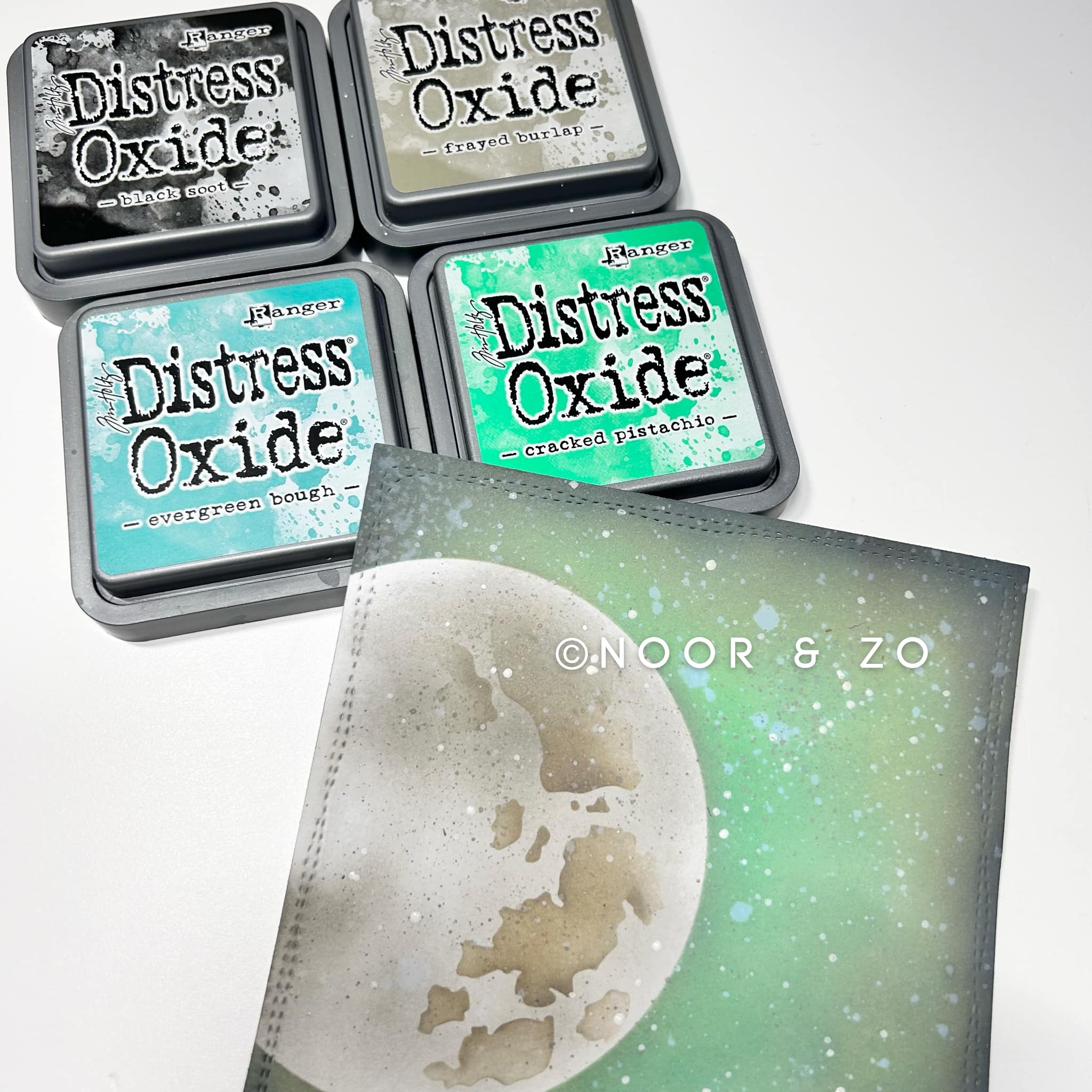 Distress Oxide inkt is een combinatie van dye inkt en pigment inkt waarmee je een geoxideerd effect krijgt als je er water op wordt sprays. Distress Oxide kan gebruikt worden in combinatie met stempels, stencils en rechtstreeks op papier. Ieder soort en kleur papier geeft een ander effect.