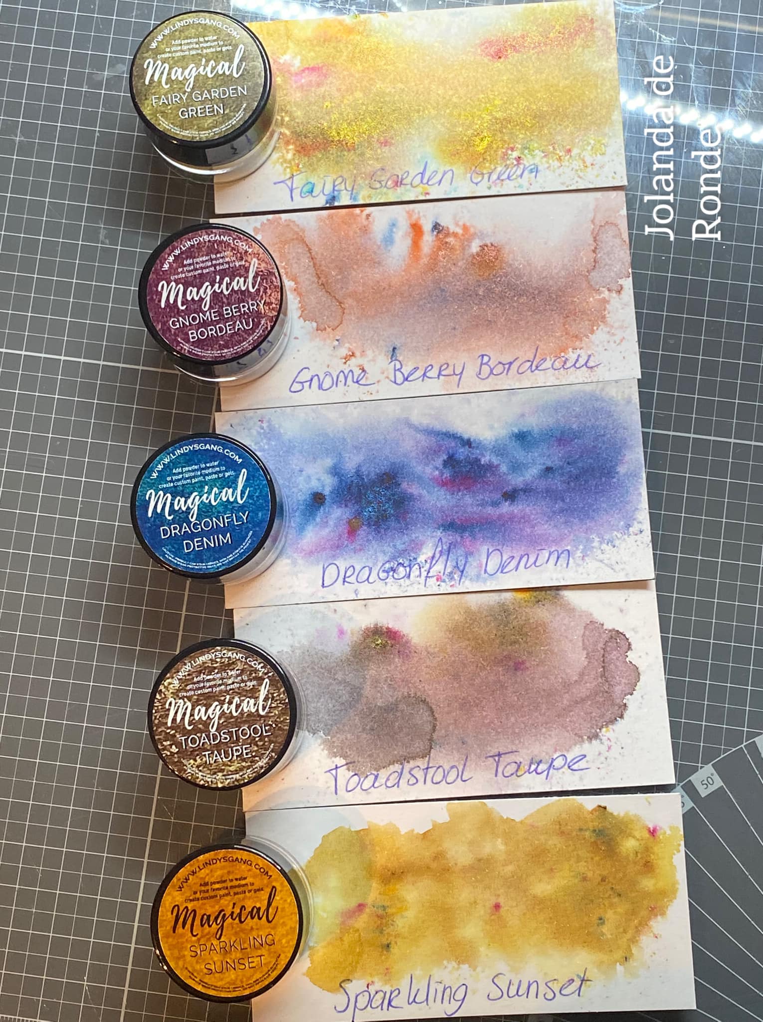 Niet-giftige, zuurvrije poedervormige kleurstoffen. Bevat geparelde micapoeders, poedervormige kleurstofpigmenten en een fixeermiddel.