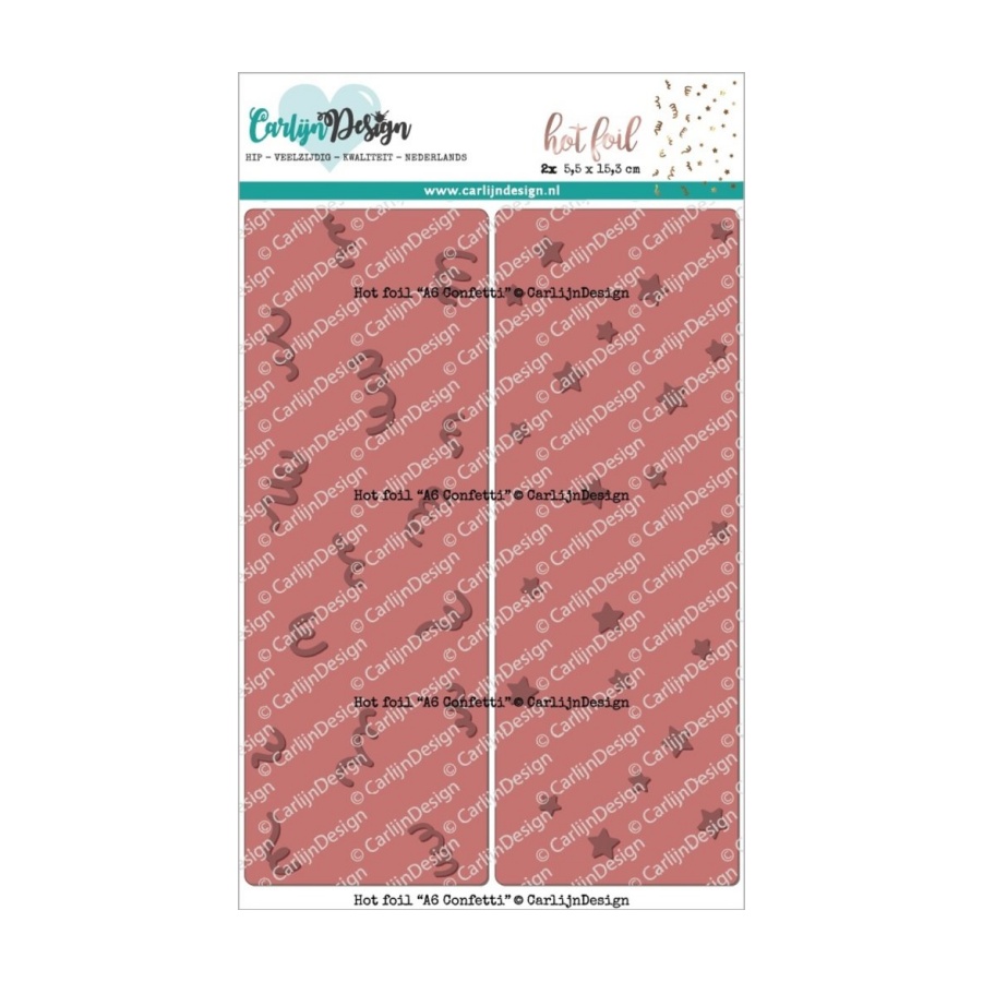 2 platen met 2 designs A6 Confetti, gemaakt van zwaarder metaal speciaal voor gebruik met hot foil. Beide platen hebben een andere design: een met confetti slierten en een met sterretjes. Je kunt ze in verschillende kleuren foilen naast elkaar. Daarna wisselen je beide platen om en zorg je dat je op beide vlakken dus de verschillende designs hebt.