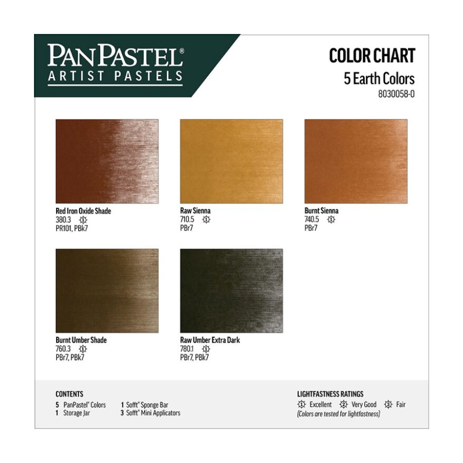 Starterset met aardkleuren. Alle kleuren kunnen gemengd worden om tussenkleuren te creëren. De set bevat 5 PanPastel-kleuren en een selectie Soft Tools.