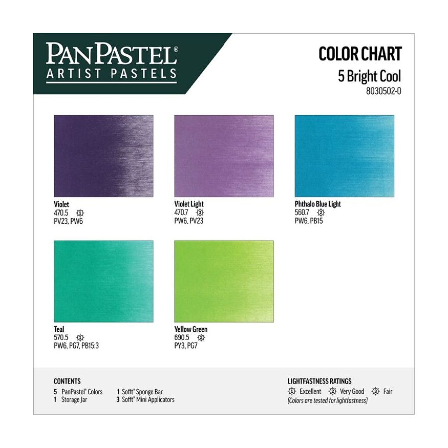 Startset met felle, koele kleuren. Alle kleuren kunnen gemengd worden om tussenkleuren te creëren. De set bevat 5 PanPastel-kleuren en een selectie Soft Tools.