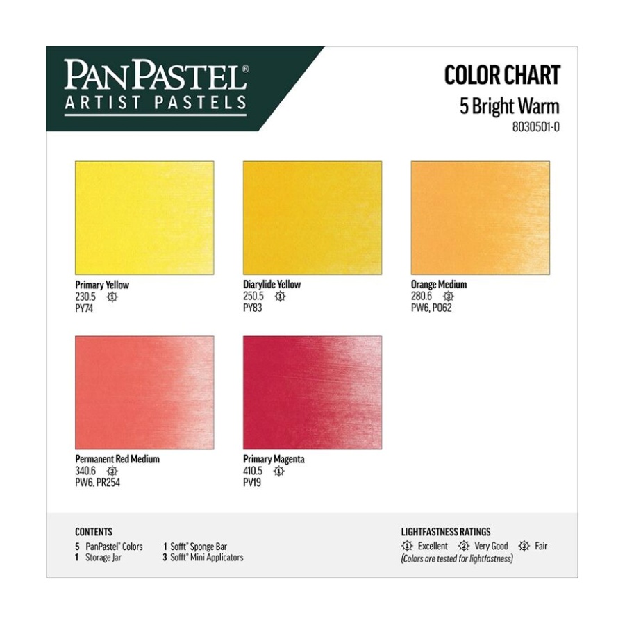 Startset met heldere, warme kleuren. Alle kleuren kunnen gemengd worden om tussenkleuren te creëren. De set bevat 5 PanPastel-kleuren en een selectie Soft Tools.