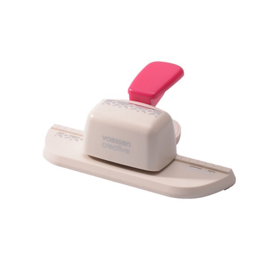 De randpons van Vaessen Creative maakt mooie decoratieve borduurpatronen aan een kaart of scrapbookvel. De randponsen zijn gemakkelijk in gebruik, door middel van de uitlijntool, de afgebeelde patronen links en rechts op de pons, kan je gemakkelijk een patroon door ponsen op een groter vel papier.
