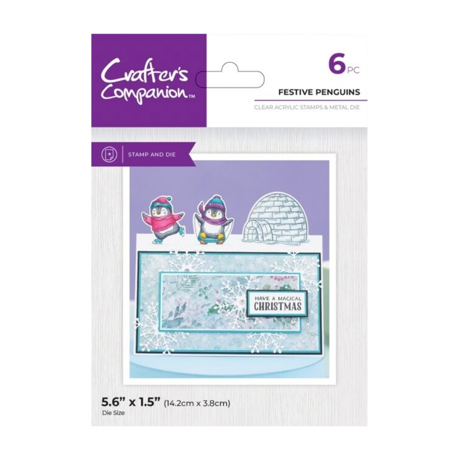De Festive Edge – Clearstamp/Snijmal – Festive Penguin set van Crafter’s Companion bevat 5 stempels om een paar schattige pinguïns te maken met een iglo en twee kerstboodschappen. Plus 1 metalen stans om daarmee de omtrek van de geïllustreerde scène in de bovenkant van de voorkant van de kerstkaart te stansen. Lijn de stans uit langs de vouwlijn van een tentvouwkaart. Stans dus vervolgens de designs uit voordat u de bijpassende ontwerpen stempelt en inkleurt.