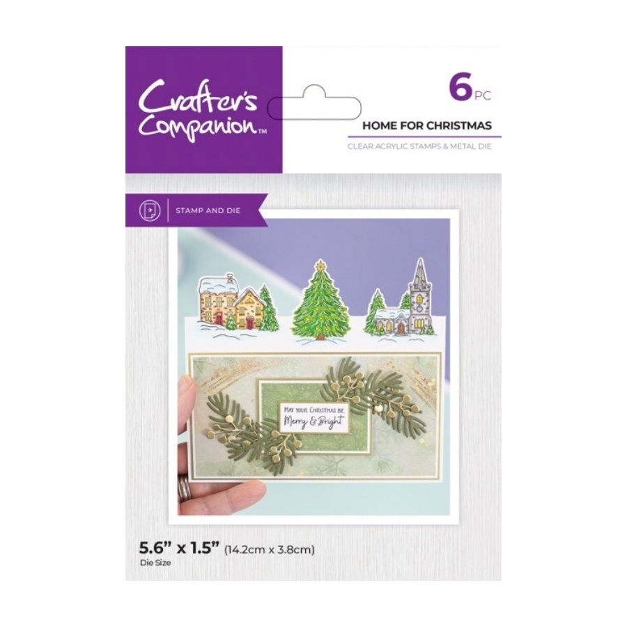 De Festive Edge – Clearstamp/Snijmal – Home for Christmas set van Crafter’s Companion bevat 5 stempels om een kerstdorp tafareel te maken met een kerstboom en besneeuwde huisjes en twee kerstboodschappen. Plus 1 metalen stans om daarmee de omtrek van de geïllustreerde scène in de bovenkant van de voorkant van de kerstkaart te stansen. Lijn de stans uit langs de vouwlijn van een tentvouwkaart. Stans dus vervolgens de designs uit voordat u de bijpassende ontwerpen stempelt en inkleurt.