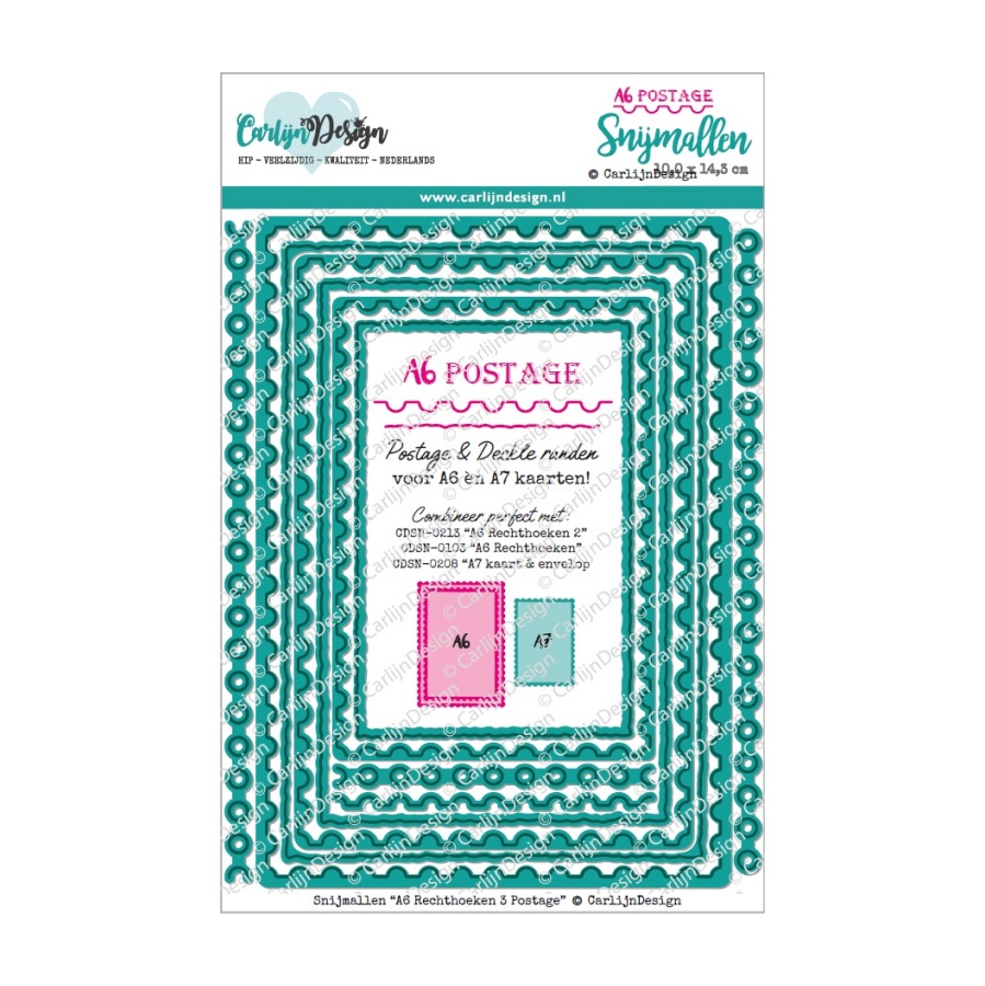 Set snijmallen in A6 formaat met een toffe postzegelrand, met daarbinnen een iets kleinere rechthoek met deckle rand. Zowel A6 als A7 formaat rechthoeken, die je ook nog zelf kunt indelen als postzegelvel met de los
