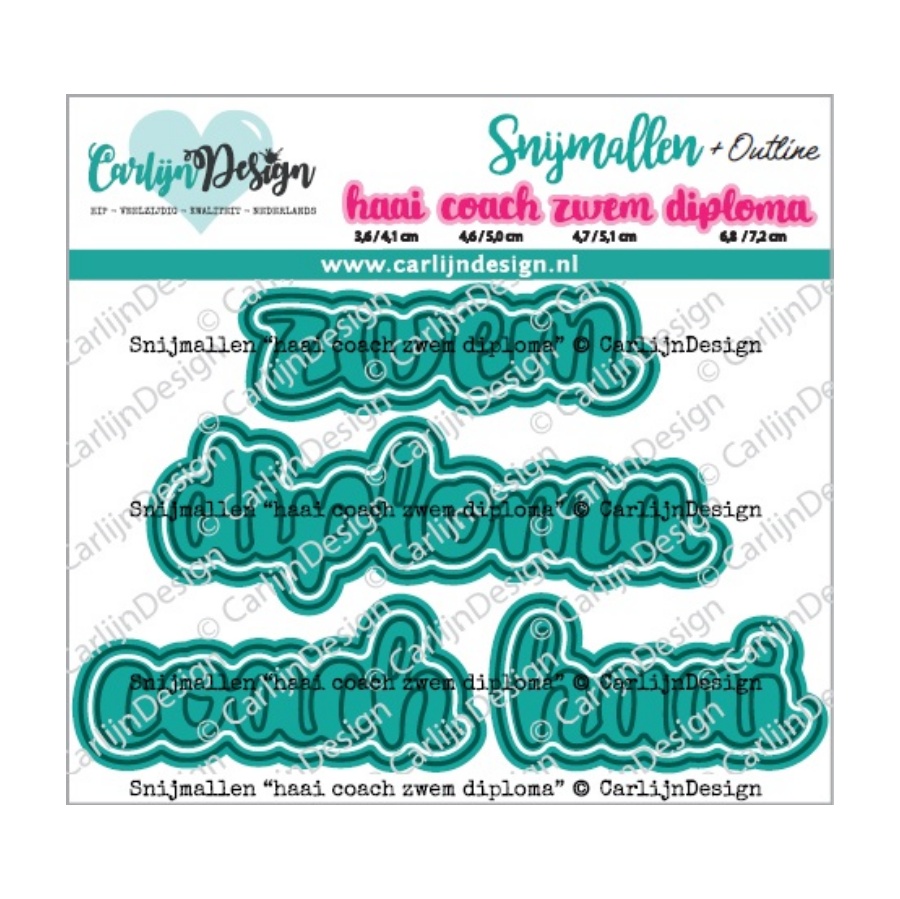Snijmallen met de woorden ‘haai’ (3,6 cm), ‘zwem’ (4,7 cm) en ‘diploma’ (6,8 cm) en ‘coach’ (4,6 cm). Allemaal met een eigen outline snijmal.