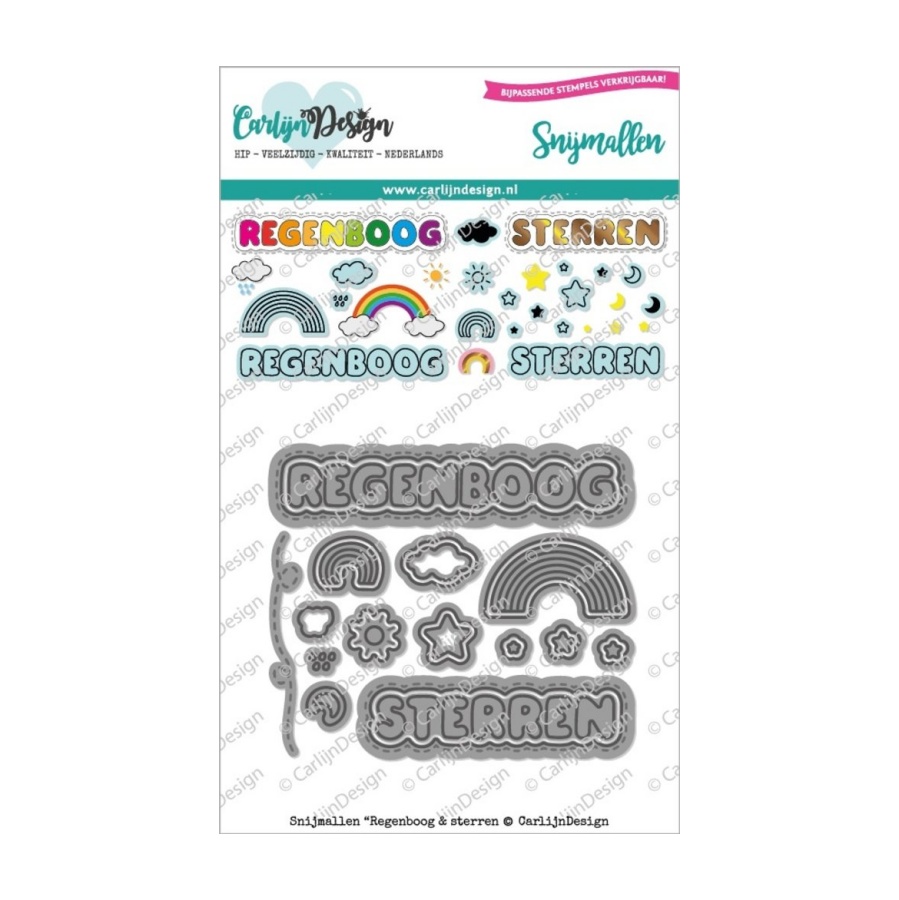 Bijpassende snijmallen voor de stempels Regenboog & sterren, gemaakt van kwalitatief metaal. Hiermee stans je perfect de gestempelde afbeeldingen uit, met een klein randje er omheen. Ook zitten de woorden er allemaal los in, die kun je zo ‘losklikken’ uit de outline mal. Het font van de losse letters is hetzelfde als dat van de Knuffel en Vrolijk Pasen set, dus met deze set heb je weer een paar letters van het alfabet erbij.