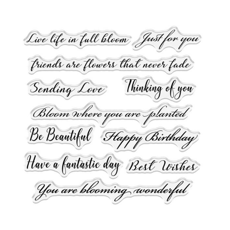 Aanpasbaar voor elke gelegenheid. De set bevat 11 stempels met berichten die bij verschillende gelegenheden passen. Sentimenten zijn onder meer ‘Just for You’, ‘Happy Birthday’, ‘Sending Love’ en ‘Live Life in Full Bloom’. Dus een doordachte boodschap om elke kaart in stijl af te maken.