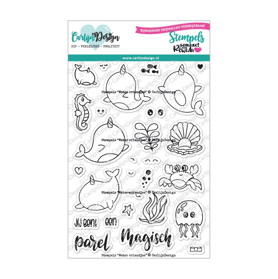 A6 formaat fotopolymeer stempels, clear stamps, ontworpen door Rowena. Deze set bevat superschattige narwals in allerlei houdingen en zelfs een baby narwal! Ook een zeepaardje, oester, krab, kwal en wat kleine accessoires. Bevat ook de teksten “jij bent”, “magisch”, “een”, “parel”.
