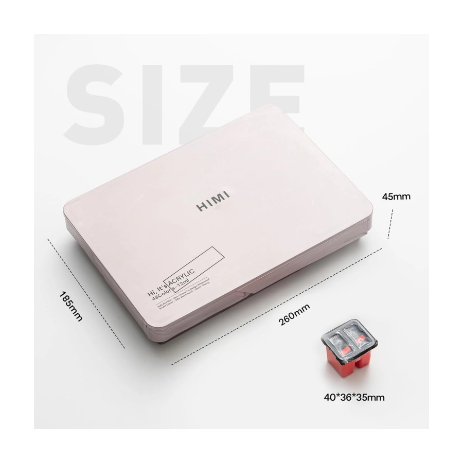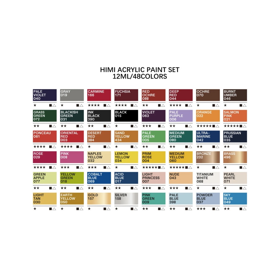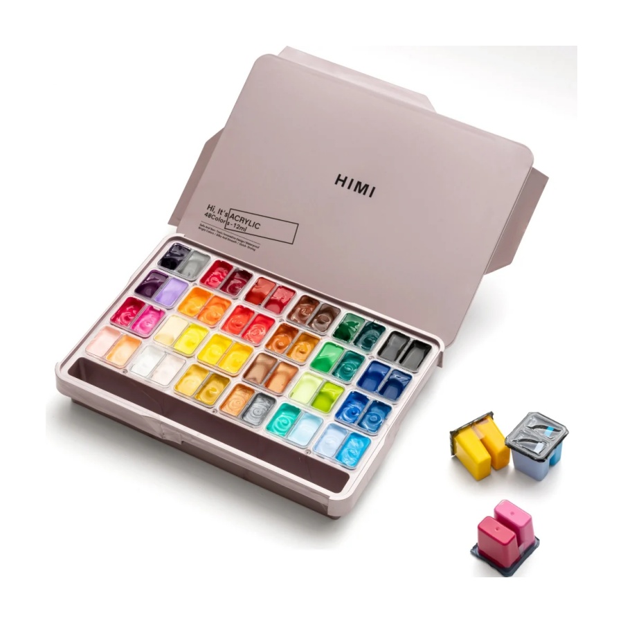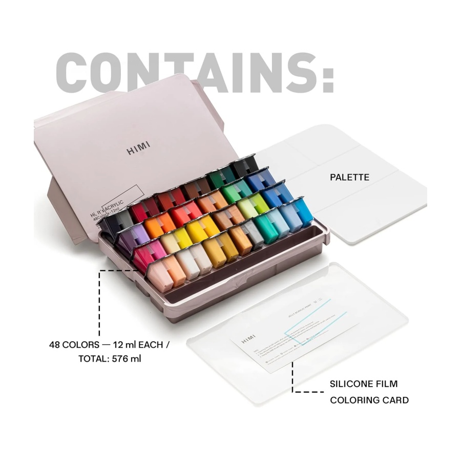 48 kleuren HIMI Twin Cup Jelly Acrylverf. Deze verf produceert levendige, rijk gepigmenteerde en langdurige, levendige kleuren die snel drogen.