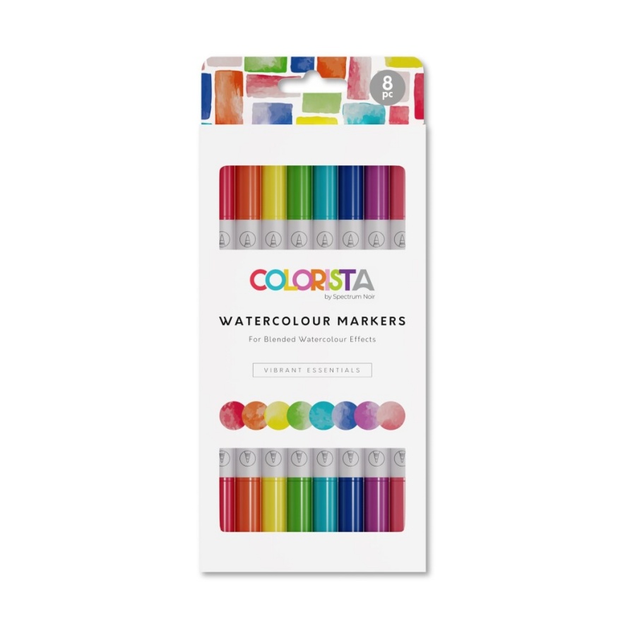 De Vibrant Essentials-set bevat acht Colorista-aquarelmarkers in een reeks levendige en gewaagde tinten die de hele regenboog bedekken. Mix en blend de wateroplosbare kleurstofkleuren op een palet voor een bijna eindeloze caleidoscoop van kleuren, kleurschakeringen en tinten. Dus wat je aandacht ook heeft getrokken, je kunt de kleuren aanpassen om je eigen prachtige aquarelillustraties te maken.