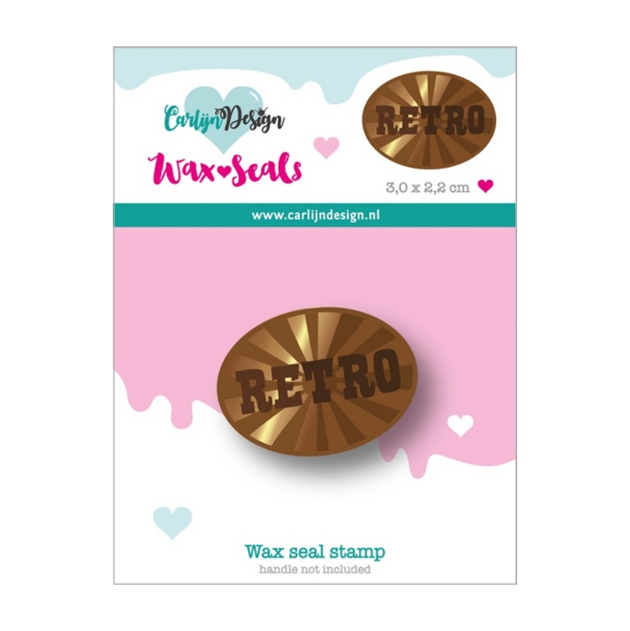 Zelfontworpen ovalen waxzegel van 3,0 x 2,2 cm, met de tekst RETRO op een sunburst achtergrond. Supergaaf bij de Retro Serie!